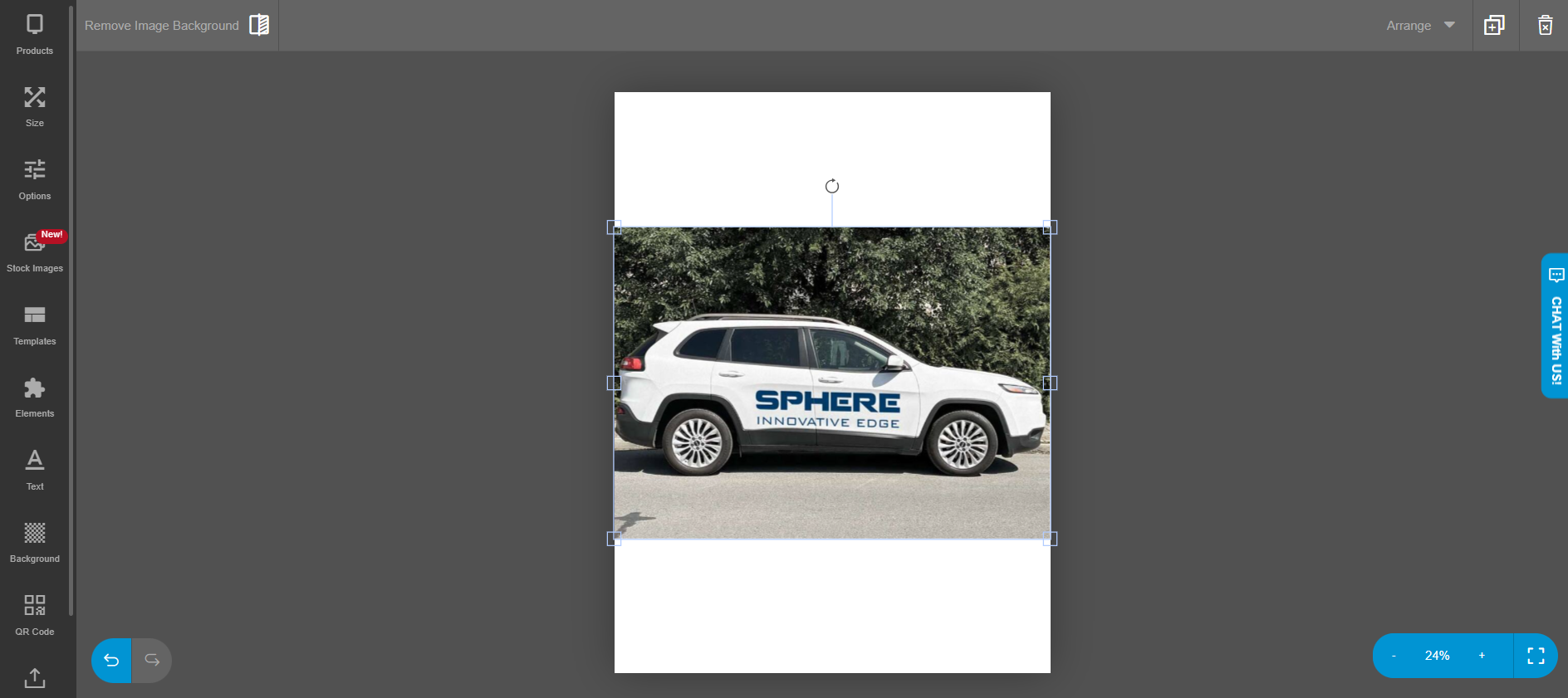 Once you upload an image into our design tool and it shows up on the design canvas, all you need to do is click on the image. Once you do, a button that reads "Remove Image Background" will appear at the top left corner of the design tool.