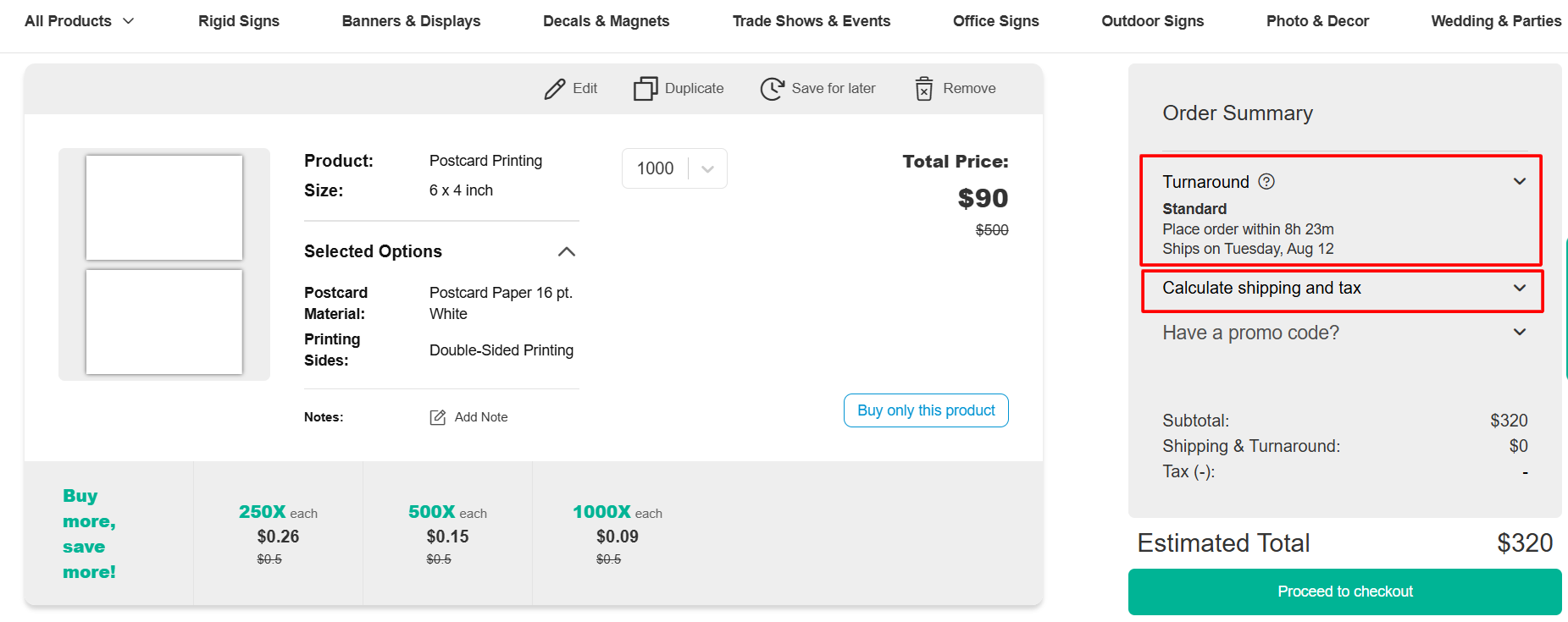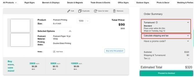 After designing your product and adding it to your cart, simply enter your ZIP code and choose the turnaround time that works best for you. You’ll also be able to select or adjust these options during checkout.